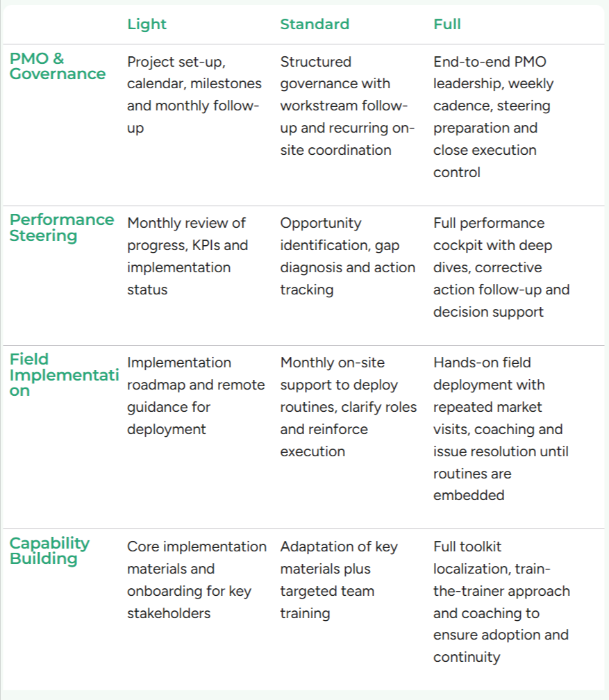Monthly on-site support to deploy routines, clarify roles and reinforce execution
